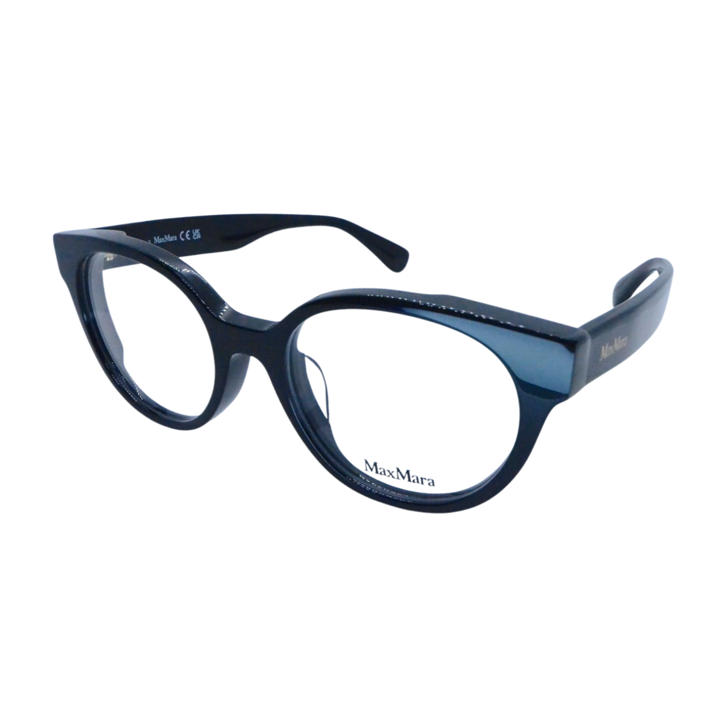 Elevate your style with this MaxMara eyewear, featuring a bold round frame in sleek glossy black acetate. The sculpted design blends timeless sophistication with a modern edge, while the wide temples highlighted by the MaxMara logo add a touch of understated luxury. Comfortable yet fashion forward, this frame is perfect for those who want to stand out with effortless elegance.