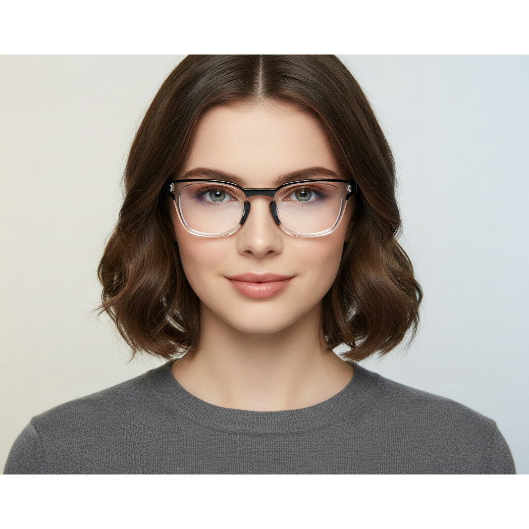 This XIT eyewear features a bold rectangular frame with a sleek black top half and a clear bottom rim, creating a sharp two-tone contrast. Its thick temples and clean design give it a modern yet timeless appeal, perfect for everyday sophistication. Stylish and versatile, it’s a frame that balances confidence with understated elegance.