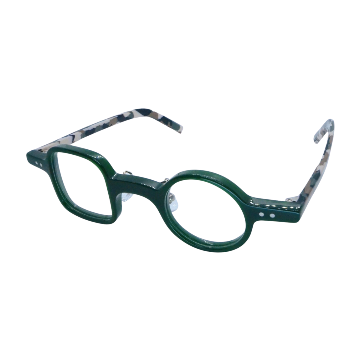This XIT eyewear showcases a bold mix of round and square lenses in a deep green frame, creating a striking avant-garde look. Its camouflage-patterned temples add a playful edge, making it a perfect blend of creativity and statement style. Designed for those who embrace individuality, this piece stands out as both artistic and wearable.